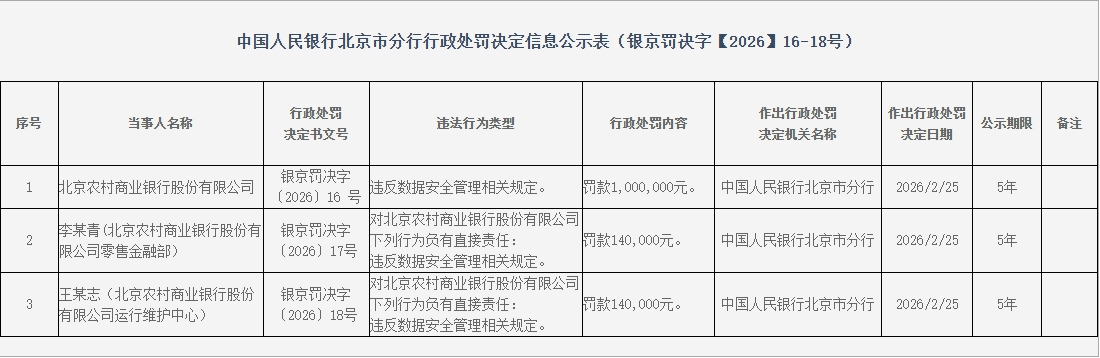 图片根源:中原百姓银止北京市分止网站截图。 奖单中表现,北京村落贸易银止股分无限公司的背法行动榜样为:违背数据平安办理相干规则。 针对于该背法背规行动,华夏群众银止北京市分止对于其奖款100万元。别的,对于李某青(北京村庄贸易银止股分无限公司整卖金融部)战王某志(北京乡下贸易银止股分无限公司运转建设核心)别离奖款14万元。(完)